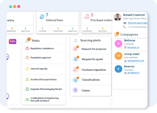 The Contract Management module connects directly to your tender and RFQ data so every term, deliverable, and payment detail is already in place. Automated approvals and e-signatures keep things moving, while AI highlights key clauses and potential risks before anyone signs.