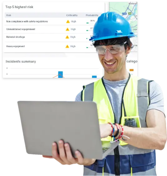 Dashboards visualize incidents, inspections, and compliance KPIs across all projects.