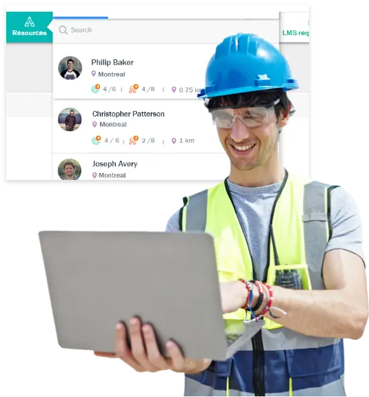 Grâce aux modules Ressources et Planification de la main-d’œuvre, prévoyez les besoins, affectez les équipes et identifiez les conflits dès le départ.
