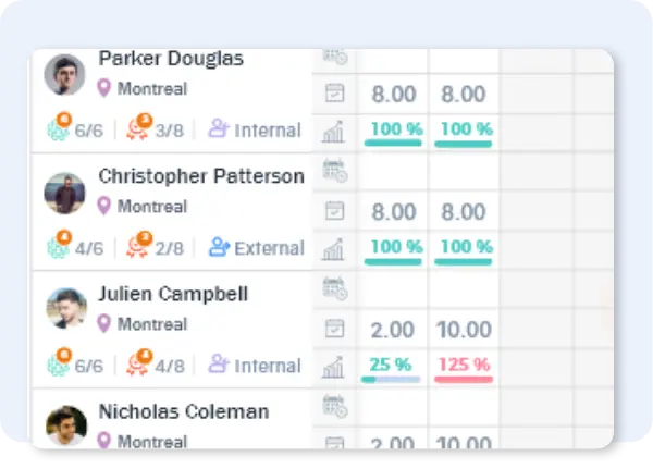 Les tableaux de bord intégrés aident les managers à optimiser l’utilisation, anticiper les besoins et garantir que chaque projet dispose du personnel nécessaire.